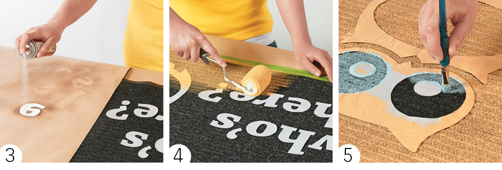 Now you need to temporarily adhere the pieces to the doormat. Working with one piece at a time, spray stencil adhesive on the back of the piece (photo 3), place it back in position, and firmly press it to the mat.